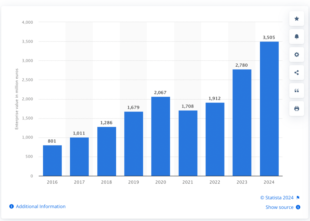 Sticking with Allianz for a moment, they would be the top target for a stadium/shirt partnership. This is because the Munich-based financial services firm is worth 116.12 billion euros, and due to their ties with Bayern Munich, it’s a well-known brand that doesn’t have a foot in the Premier League.